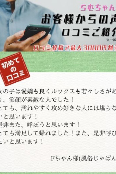 「ギャルっぽいのに、こんなに甘えん坊で優しい子…?」そんなギャップ萌えを探している方、ぜひ一度らむちゃんで夢見心地な体験を味わってみてください!なお、業界未経験の女の子ですので、くれぐれも優しくお相手してください!